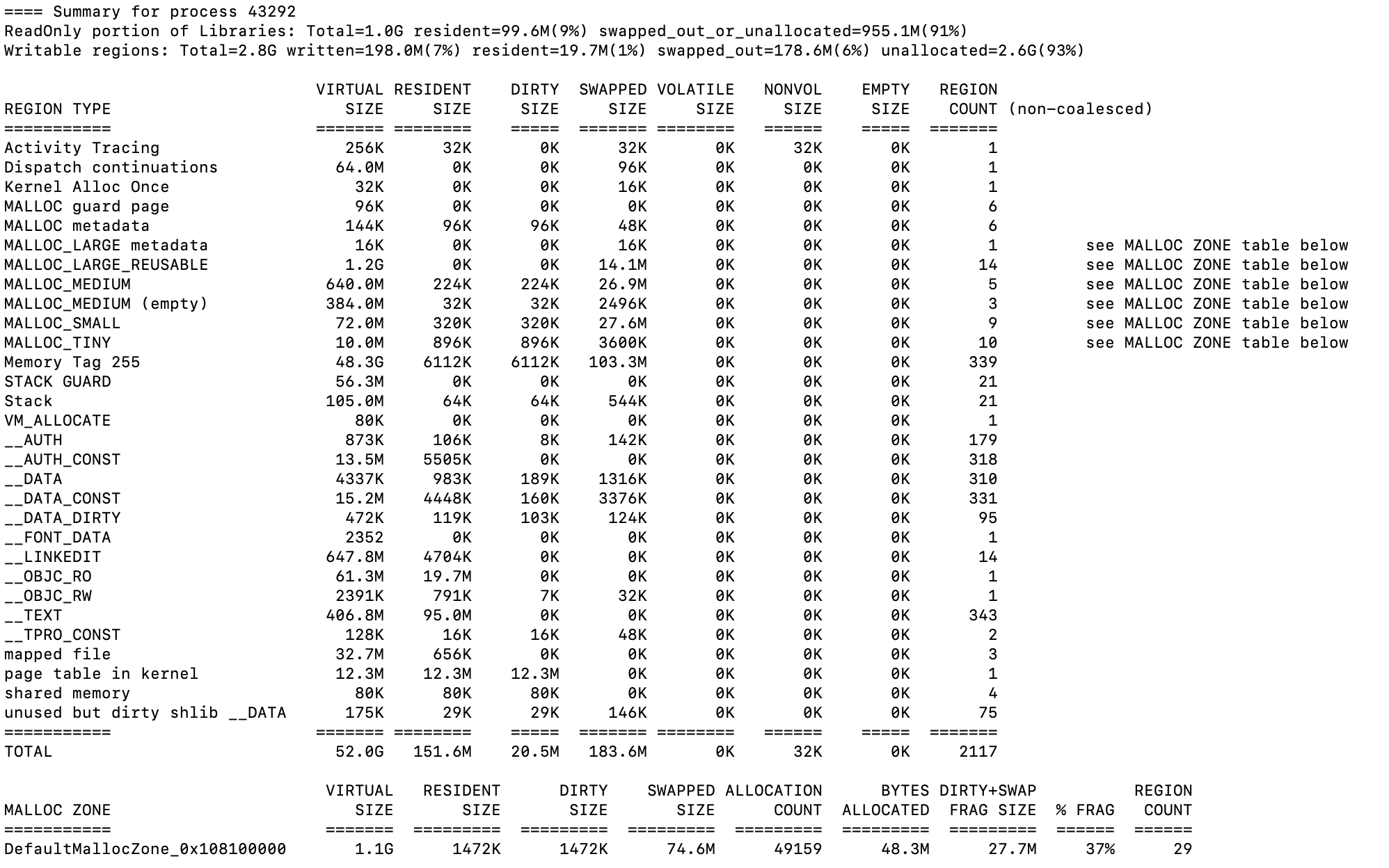 __LINKEDIT 106920000-106960000 [ 256K 20K 20K 0K] r--/r-- SM=COW /opt/homebrew/Cellar/node/23.11.0/bin/node