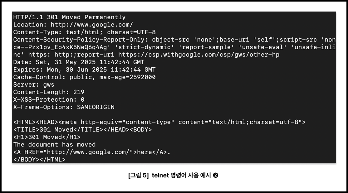 이 응답은 클라이언트에게 이 주소는 더 이상 사용되지 않으며, www가 포함된 새로운 주소로 이동해야 한다는 사실을 알려주는 것이다. 브라우저는 이 응답을 받으면 자동으로 http://www.google.com/으로 이동하지만, telnet에서는 HTML 텍스트가 그대로 출력된다.