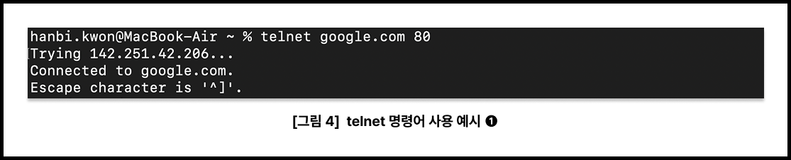 터미널에서 telnet 명령어를 사용하면, TCP 연결을 직접 맺고 HTTP 요청을 수작업으로 보낼 수 있다. 이는 브라우저가 자동으로 처리하는 통신 과정을 직접 확인해볼 수 있는 유용한 실습이다.