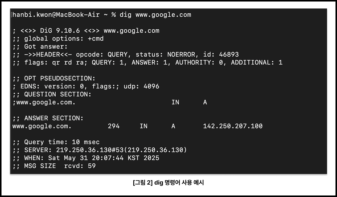 - ANSWER SECTION: 응답 IP 주소와 TTL(Time To Live)