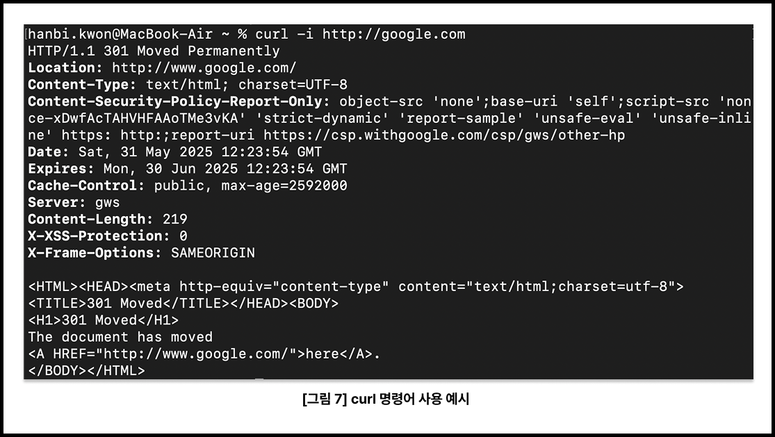 응답의 하단에는 HTML 형태의 안내 메시지도 포함되어 있다. 브라우저는 이 메시지를 기반으로 자동 리디렉션을 수행하지만, curl에서는 이 내용을 텍스트 그대로 확인할 수 있다.