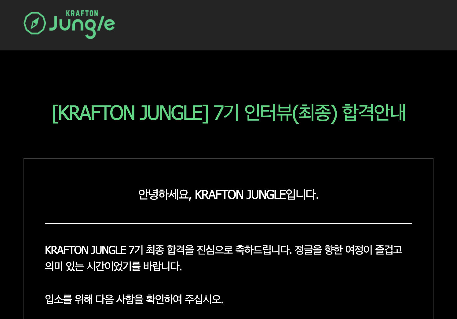 크래프톤 정글 7기 최종 합격 소식을 받았다. 지원하는 과정에서 다른 사람들의 후기를 많이 참고했고 도움도 많이 받았다. 내가 그랬던 것처럼 다음 기수에 지원하는 분들께 작게나마 도움이 되고 싶어 합격 후기를 남긴다.